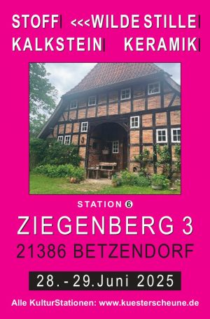 An diesem Wochenende sind in dem schönen Ort Betzendorf, bei Lüneburg, insgesamt 18 Kunst-Kulturstationen zu besuchen! Unter Station 6 (Ziegenberg 3) finden Sie mich mit Malerei, Druckwerken, Solarbildern und Zeichnungen aus dem Zyklus <<< WILDE STILLE.